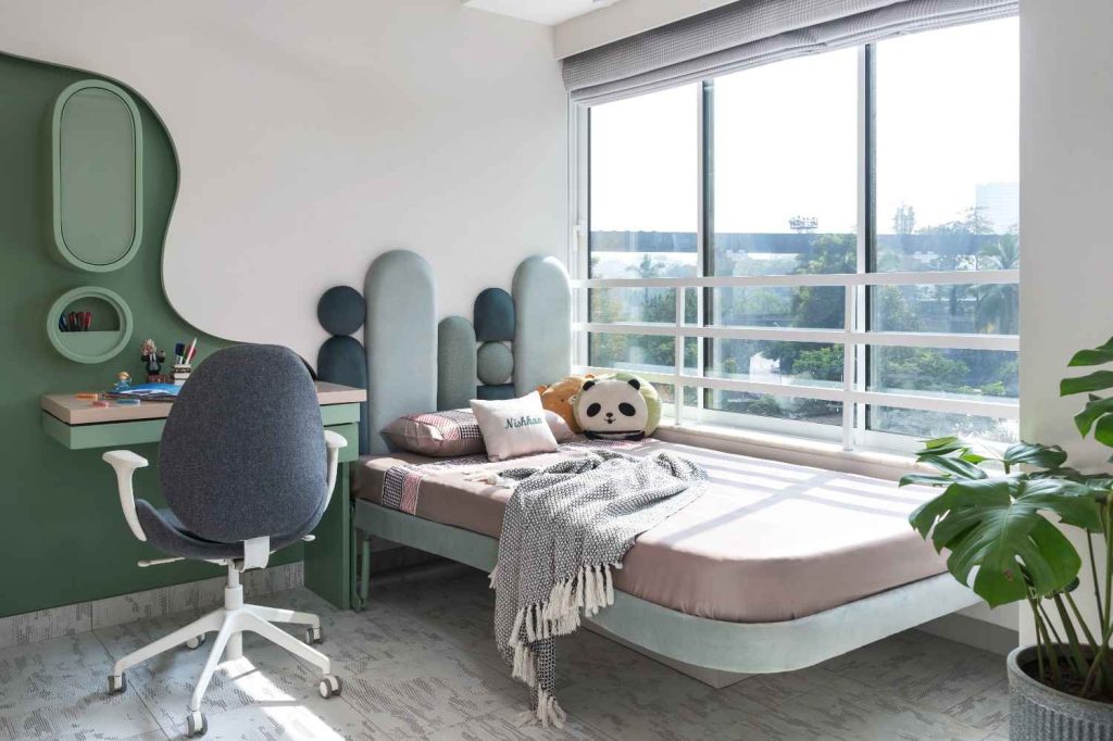 Each bedroom becomes a personalised emotional version of the same story — tender lilacs for a soft feminine quietude, modern blues for a confident contemporary clarity, mint and playful tones in the child’s room to honour innocence and imagination. Personality changes, but unity stays — because the same calm foundational palette holds all the rooms together.