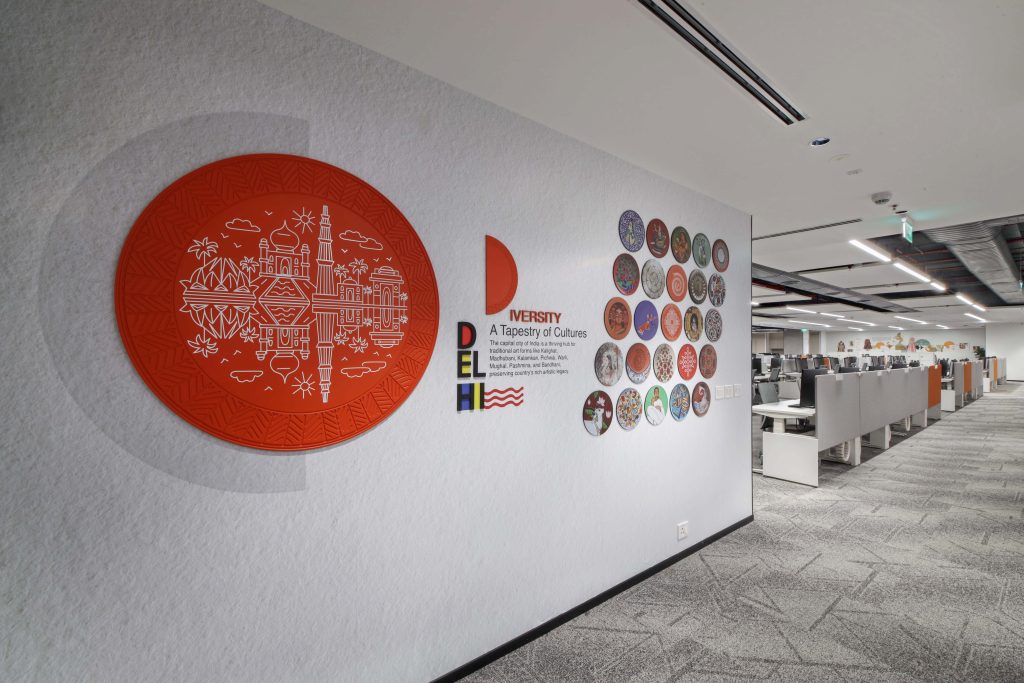 Special attention was given to design features in Noida, notably the reception areas, expansive lobby, long passages, and circulation zones. These were intended to encourage connections, reflect openness, and ensure smooth movement, setting an inviting tone for the workplace. By blending function with visual clarity, the space enhances both experience and efficiency.