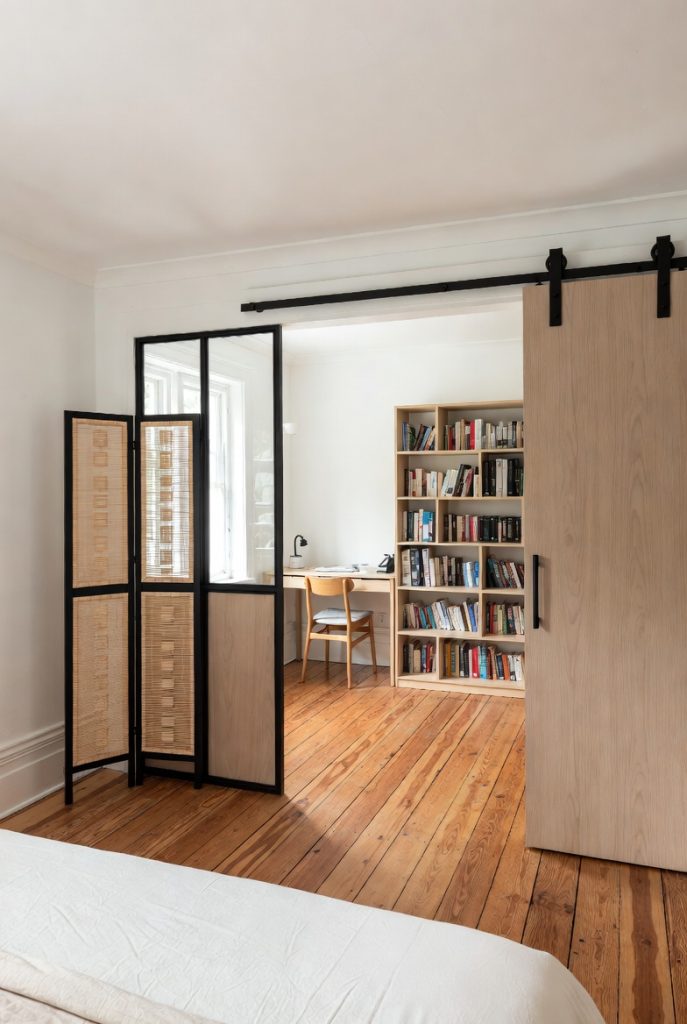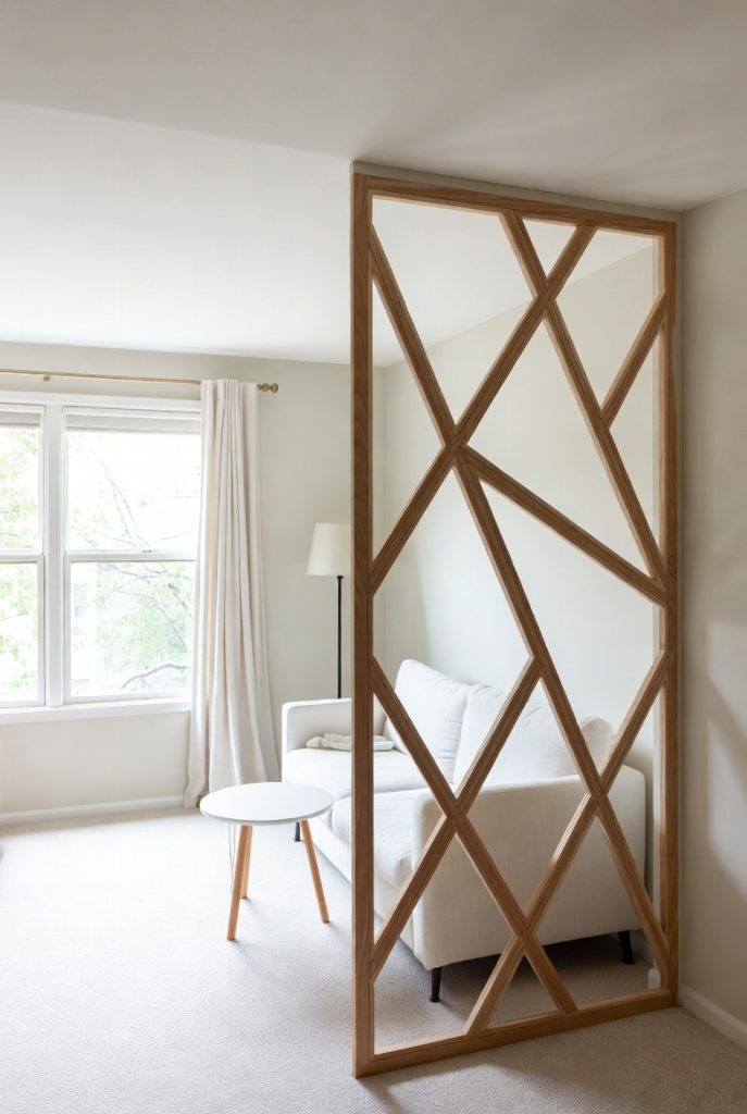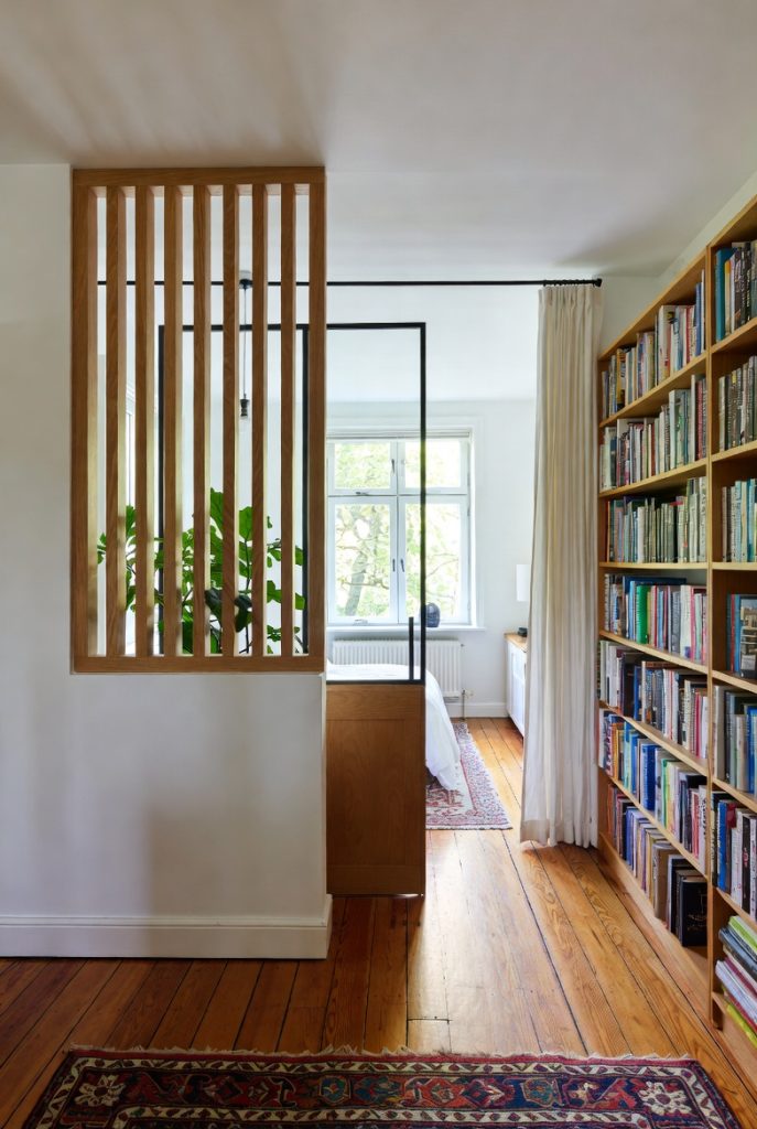 - Studio apartment: A wooden slat divider separates the bed from the living area. Add a softwall for a temporary workspace.