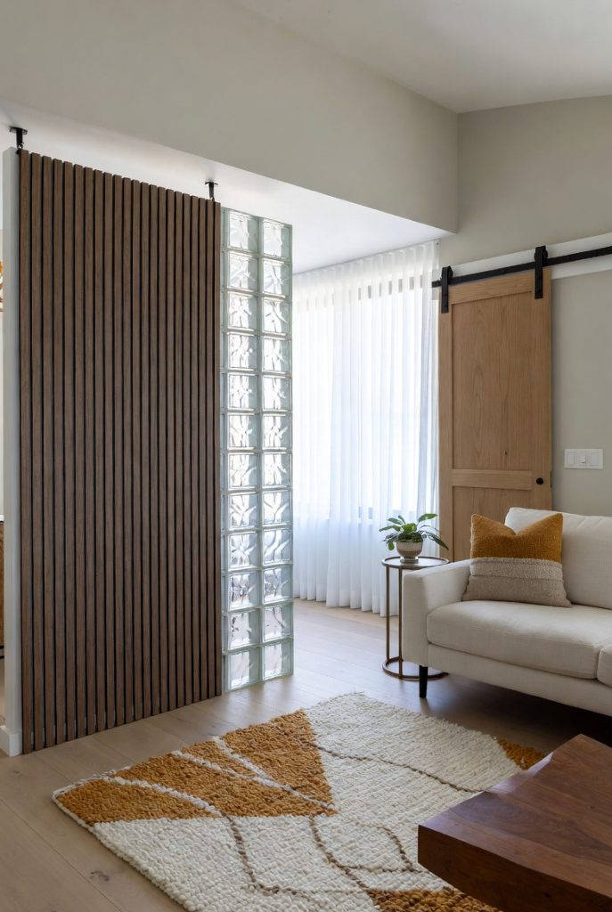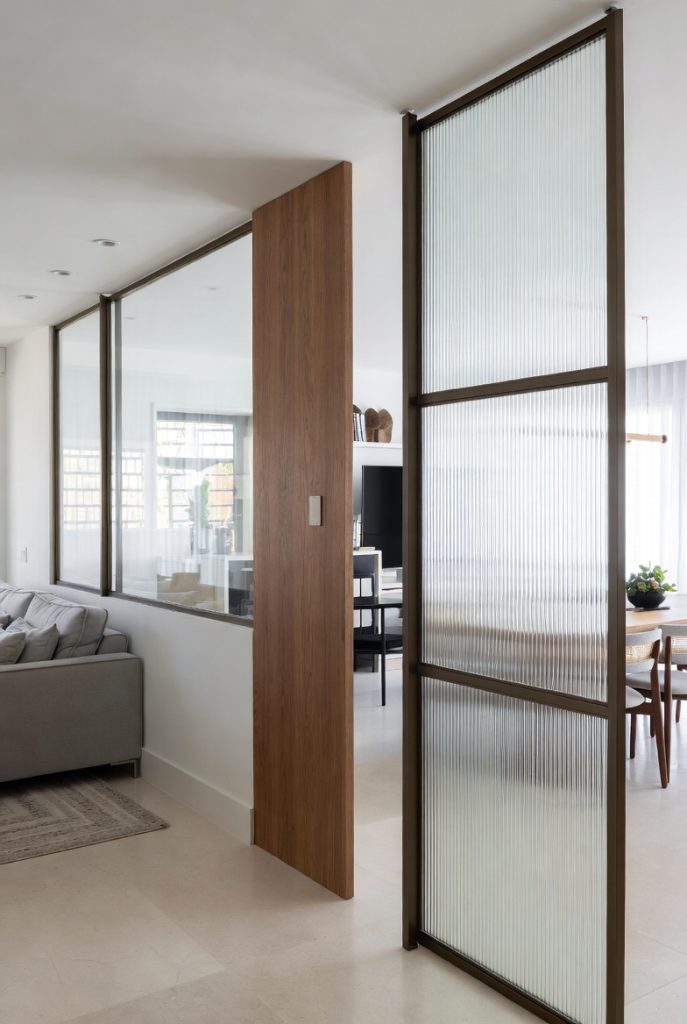 Benefits: Glass keeps spaces open and light-filled while separating them visually. Frosted or textured glass adds privacy.