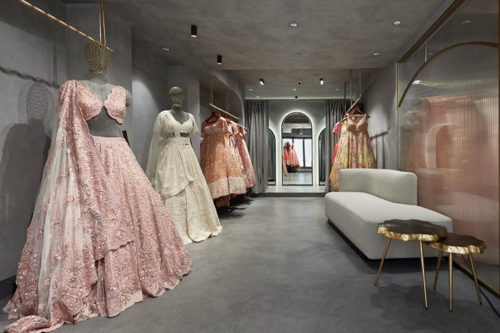 From the very beginning, working with them was a delight. They knew exactly what they wanted: a serene haven for brides-to-be, a dazzling space for the vibrant Sangeet outfits, and a chic section for everyday wear. Their clarity extended down to the number of dresses to be displayed, challenging us to maximize the available space with thoughtful planning.